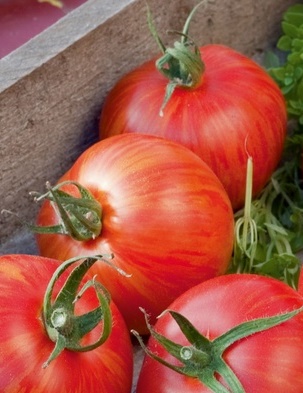 • Aus der Gruppe der Ochsenherztomaten, besonders attraktiv durch ihre gefurchte Beutelform. Diese sehr beliebte, attraktive Fleischtomate liefert mittelgroße bis große Früchte mit 120-300 g Fruchtgewicht und frisch aromatischem Geschmack. Zweitriebige Kultivierung empfohlen.